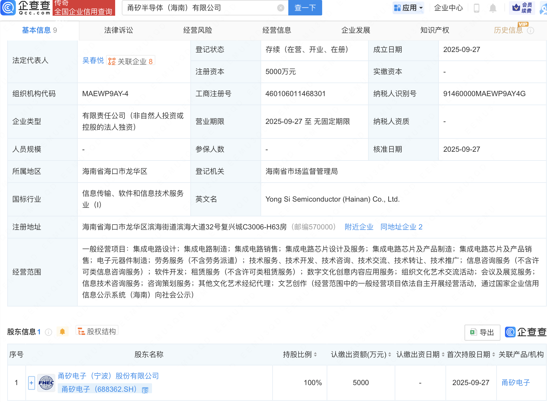 近日,甬矽半导体(海南)有限公司成立,注册资本5000万元,经营范围包含:集成电路设计;集成电路制造;集成电路销售;集成电路芯片设计及服务;集成电路芯片及产品制造等。企查查股权穿透显示,该公司由甬矽电子(688362)全资持股。